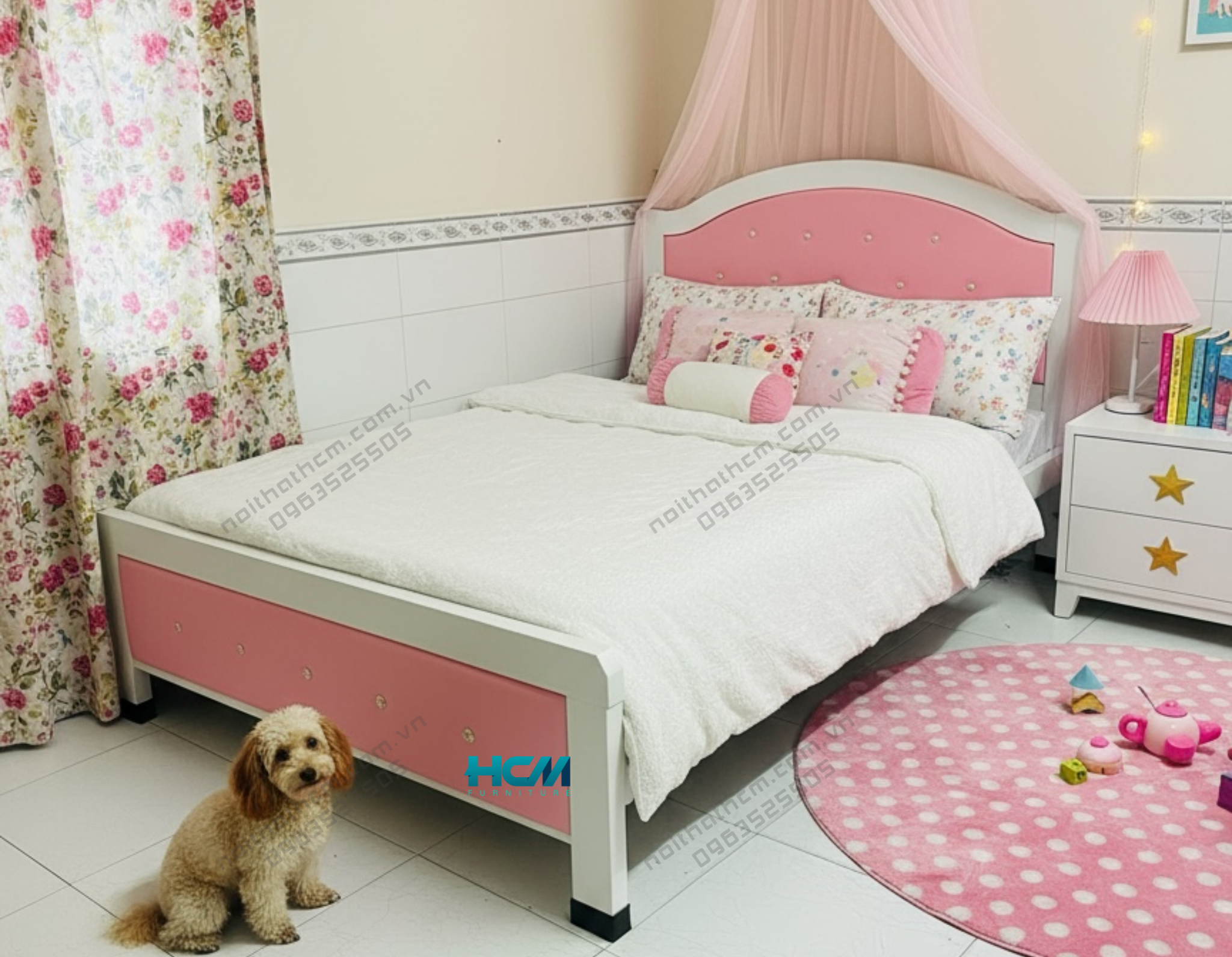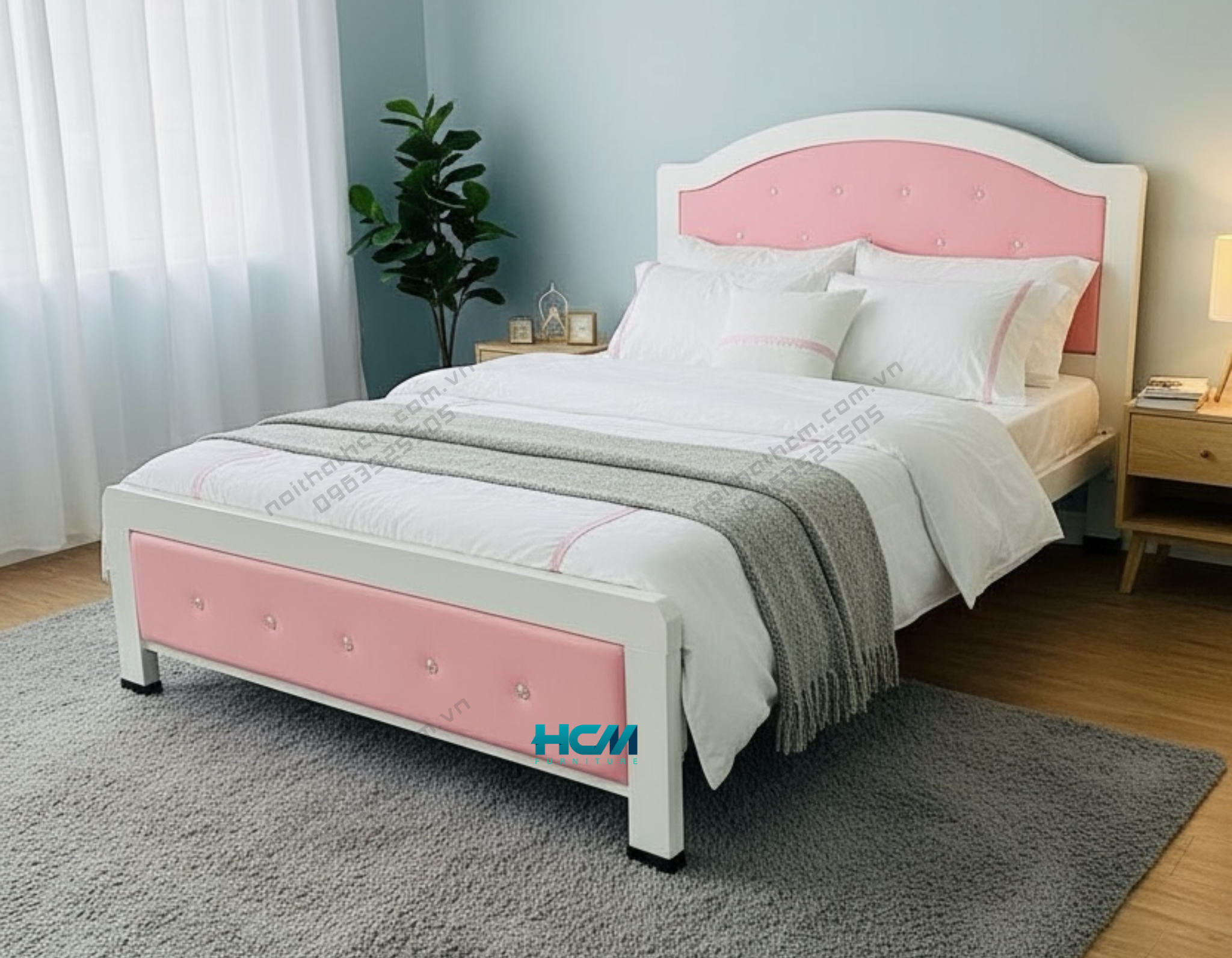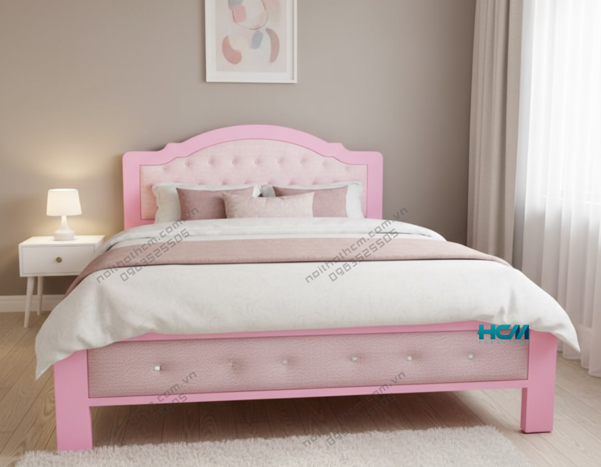 Giường sắt Hoàng Gia màu hồng sang trọng – khung sắt chắc chắn, hoa văn tinh xảo, sơn tĩnh điện bền đẹp. Mang đến phòng ngủ nữ tính, lãng mạn và cao cấp.