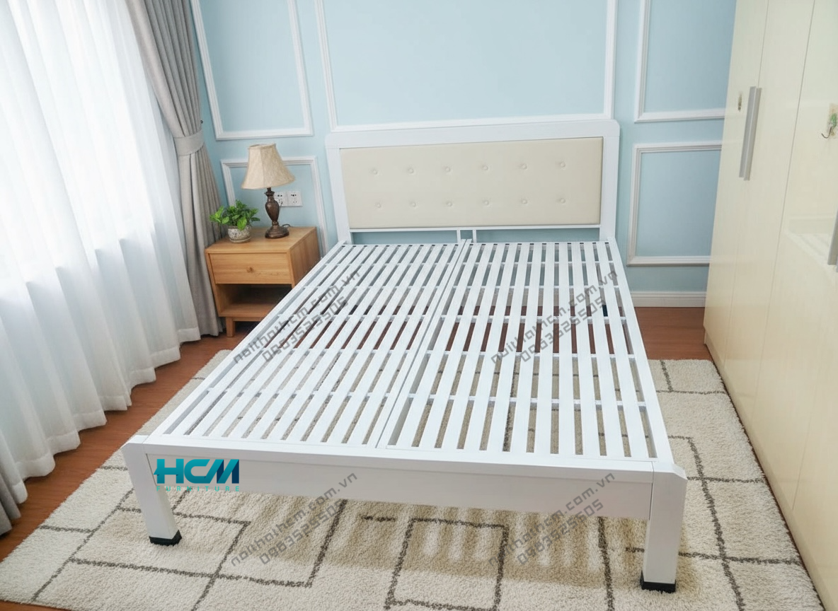 Giường sắt hộp màu trắng kem – khung sắt chắc chắn, sơn tĩnh điện bền đẹp, thiết kế hiện đại, bảo hành 2 năm. Nhiều kích thước lựa chọn, phù hợp mọi không gian phòng ngủ.