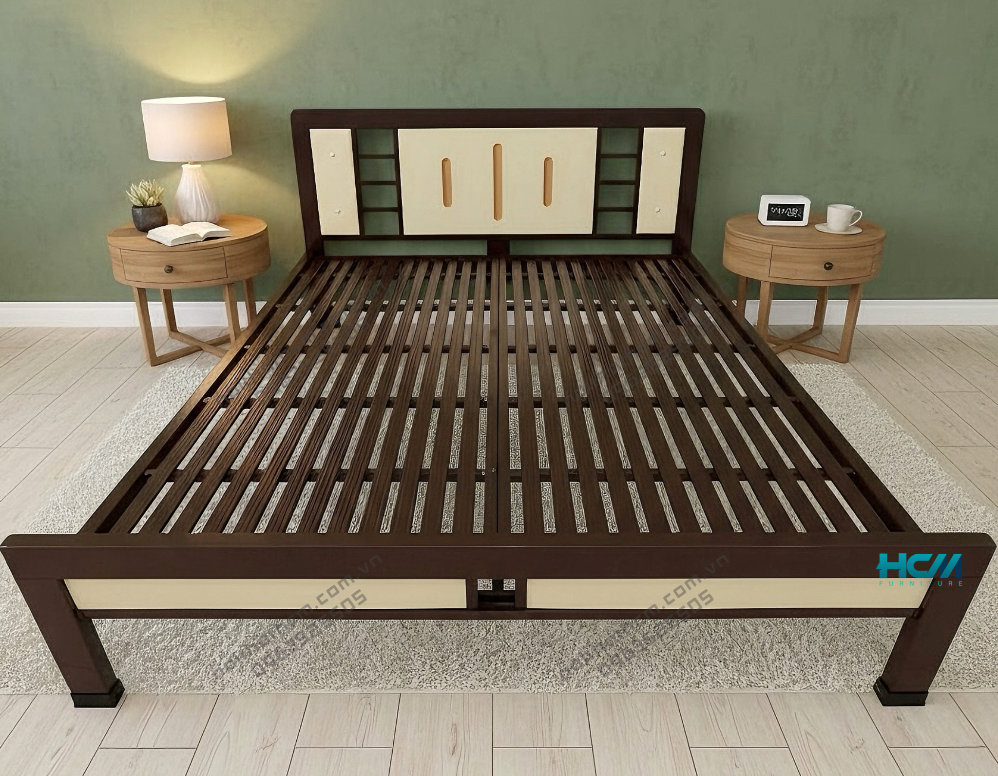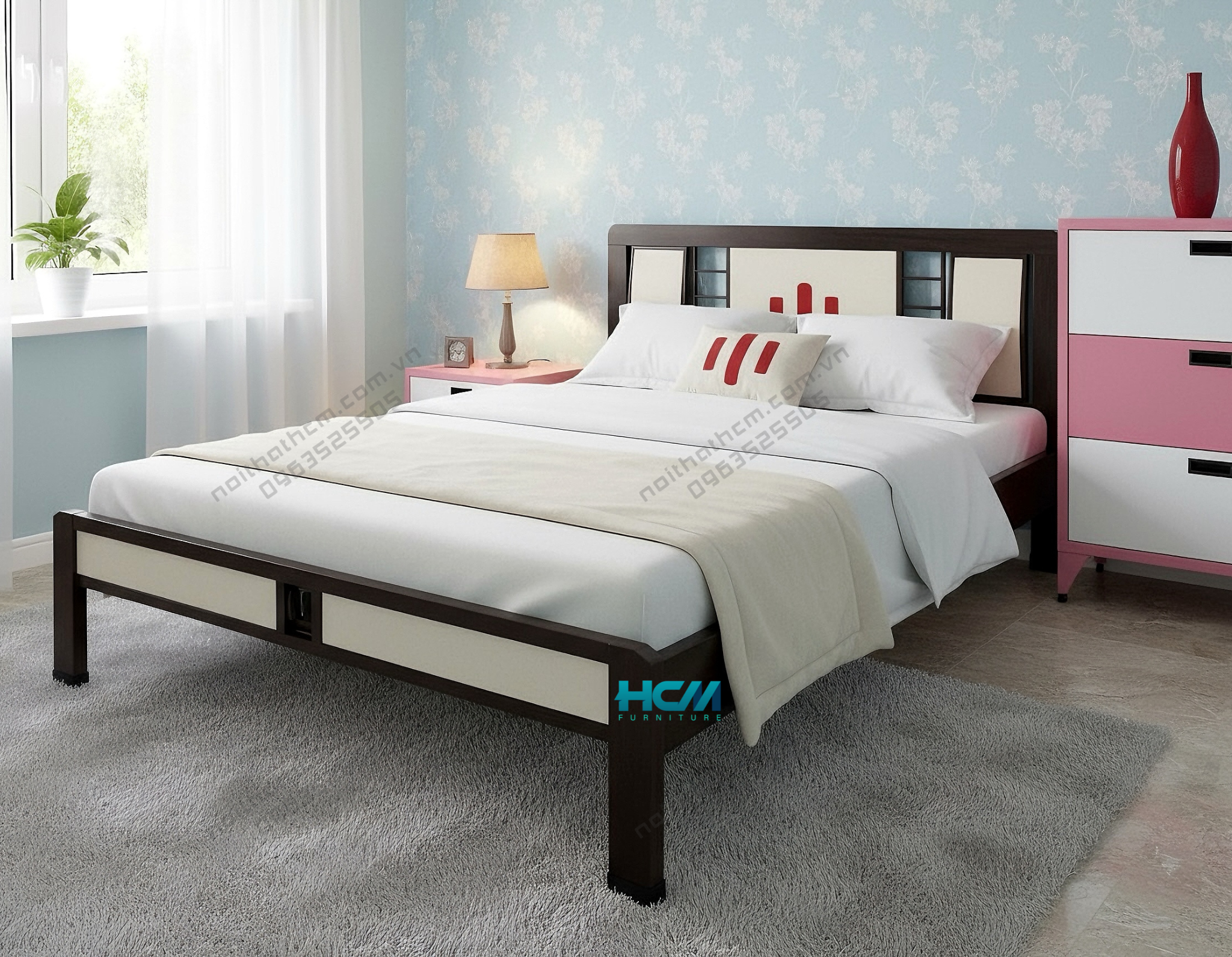 Giường sắt hộp kiểu gỗ – thiết kế hiện đại, khung sắt chắc chắn sơn tĩnh điện, bề ngoài sang trọng như giường gỗ, bền đẹp và dễ vệ sinh.