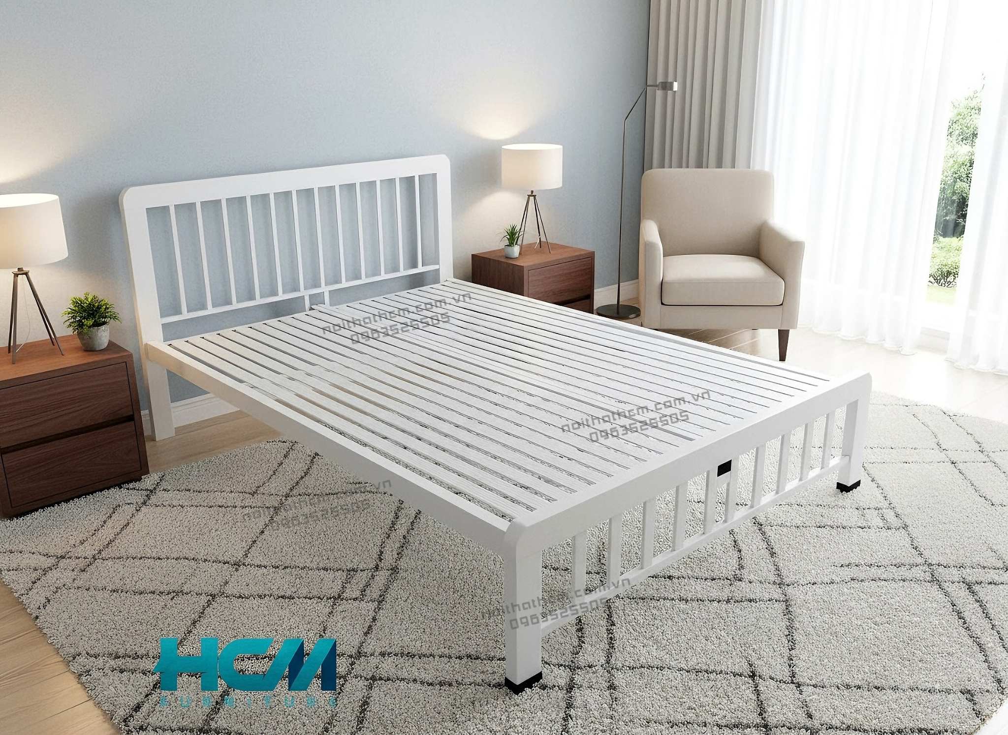 Giường sắt mỹ nghệ màu trắng – thiết kế sang trọng, khung sắt hộp 1.4mm chắc chắn, sơn tĩnh điện chống gỉ sét. Nhiều kích thước lựa chọn, giao hàng và lắp đặt miễn phí tại TP. Hồ Chí Minh.
